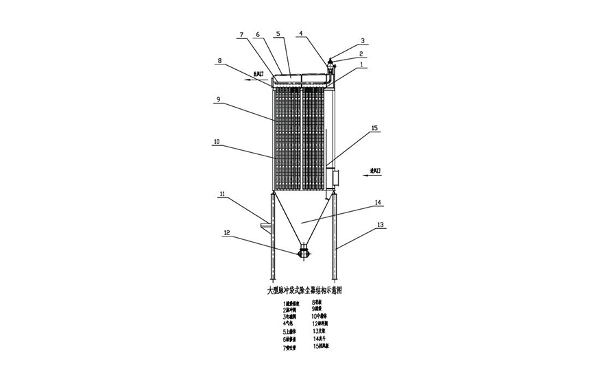 CD长袋脉冲袋式除尘器的主体结构由上箱体、中箱体、袋室、灰斗、卸灰装置、喷吹装置、和控制仪几大部分组成。并配有基础支柱、爬梯、栏杆、检修门等等,并可根据用户要求选配先进的设备运行监测系统。