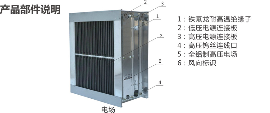 每个收集段由很多数量的平行板组成,通以高压直流电(极性与电离器一致,但电压减半)以形成电场,带电微粒被接地板吸引的同时也受到带电板的驱赶。正因如此,当气流中含有带电微粒时,可以被高效去除。